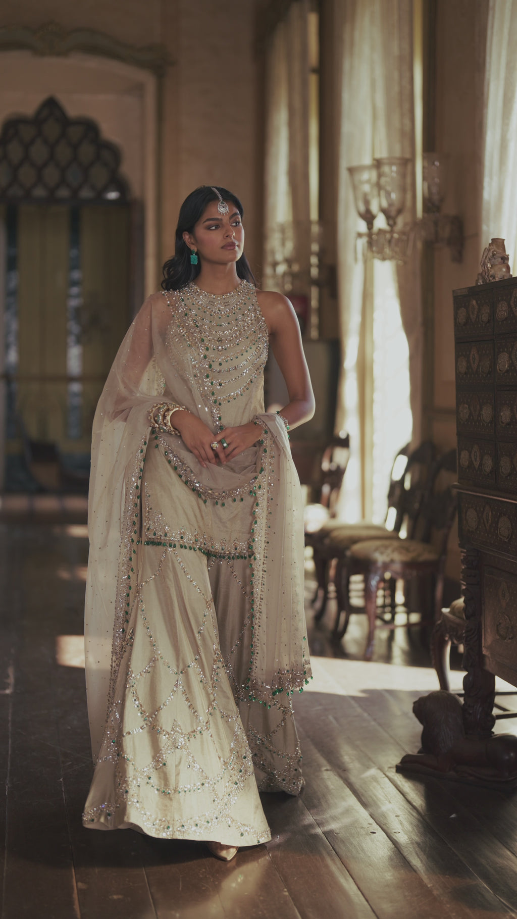 This jewelled sharara set features embroidery in emerald and crystal stones in varying shapes and sizes on a tissue silk base. The matching top has emerald drops at the hem. The tissue organza dupatta has a matching embroidery and tassels on all four sides.