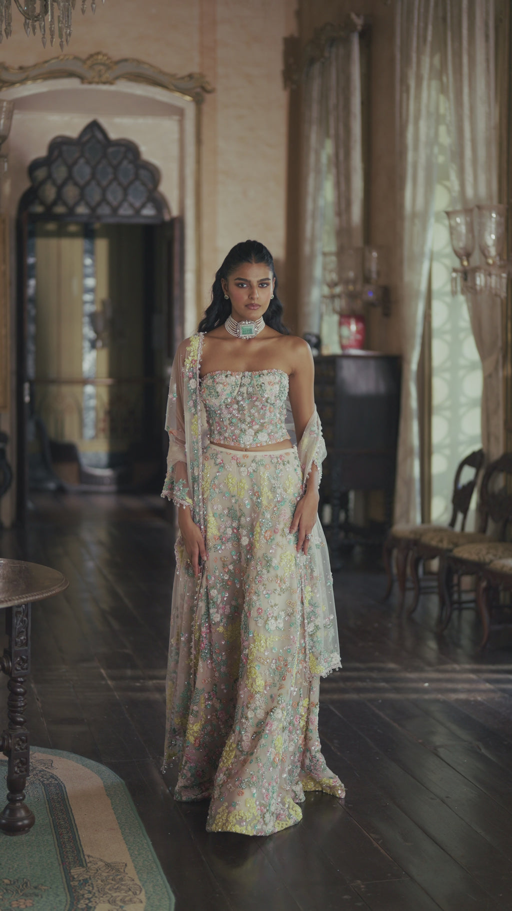 This sharara set features heavy multi-coloured thread embroidery. It is further accentuated with sequins, pearls and beads. The corset blouse is paired with full embroidered sharara and a matching dupatta.