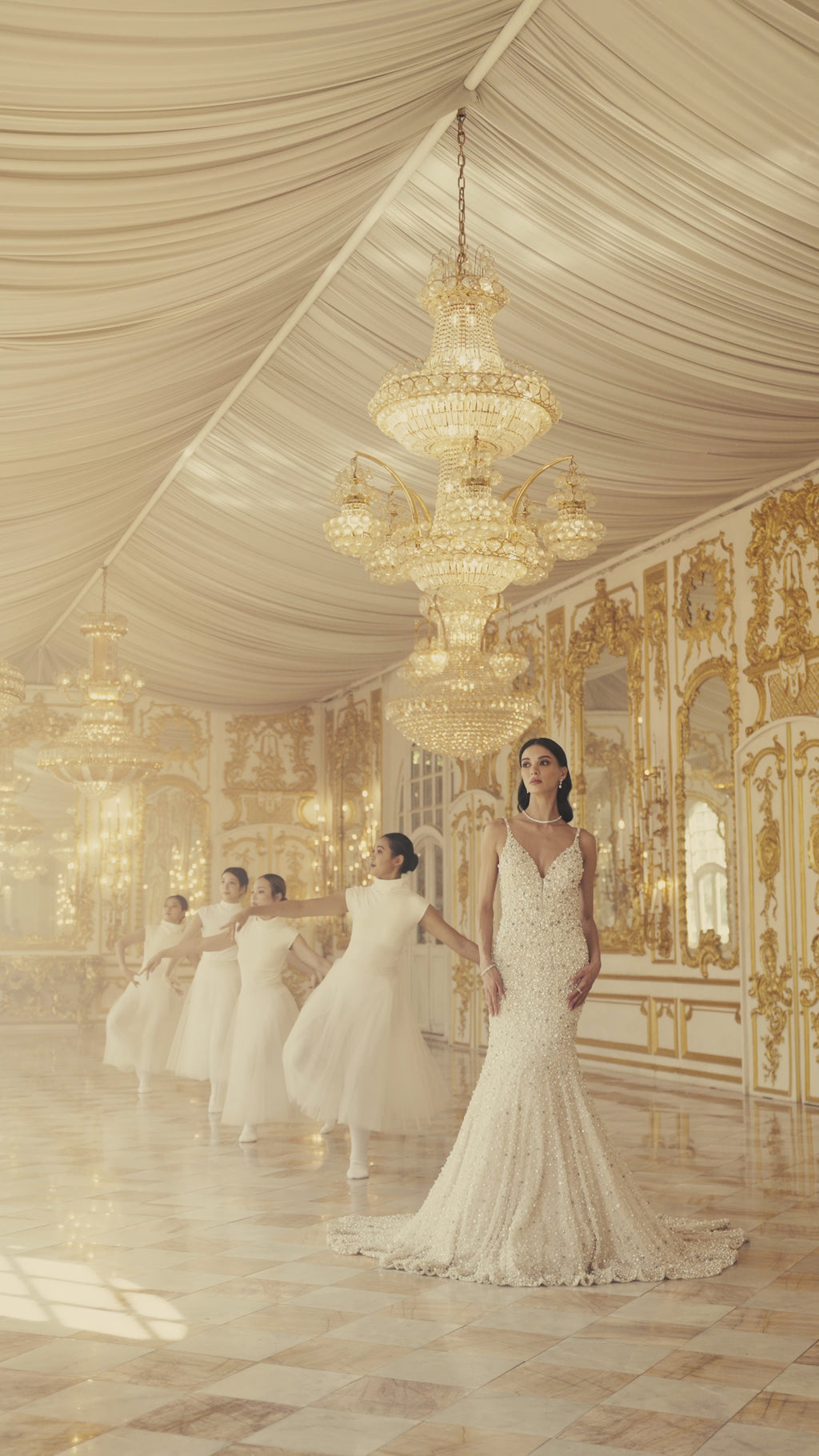 This ivory gown features heavy sprinkling of assorted shapes and sizes of pearls and crystals. The gown has a plunging neckline and a bare back. The outfit has a fit and flare silhouette along with a trail.