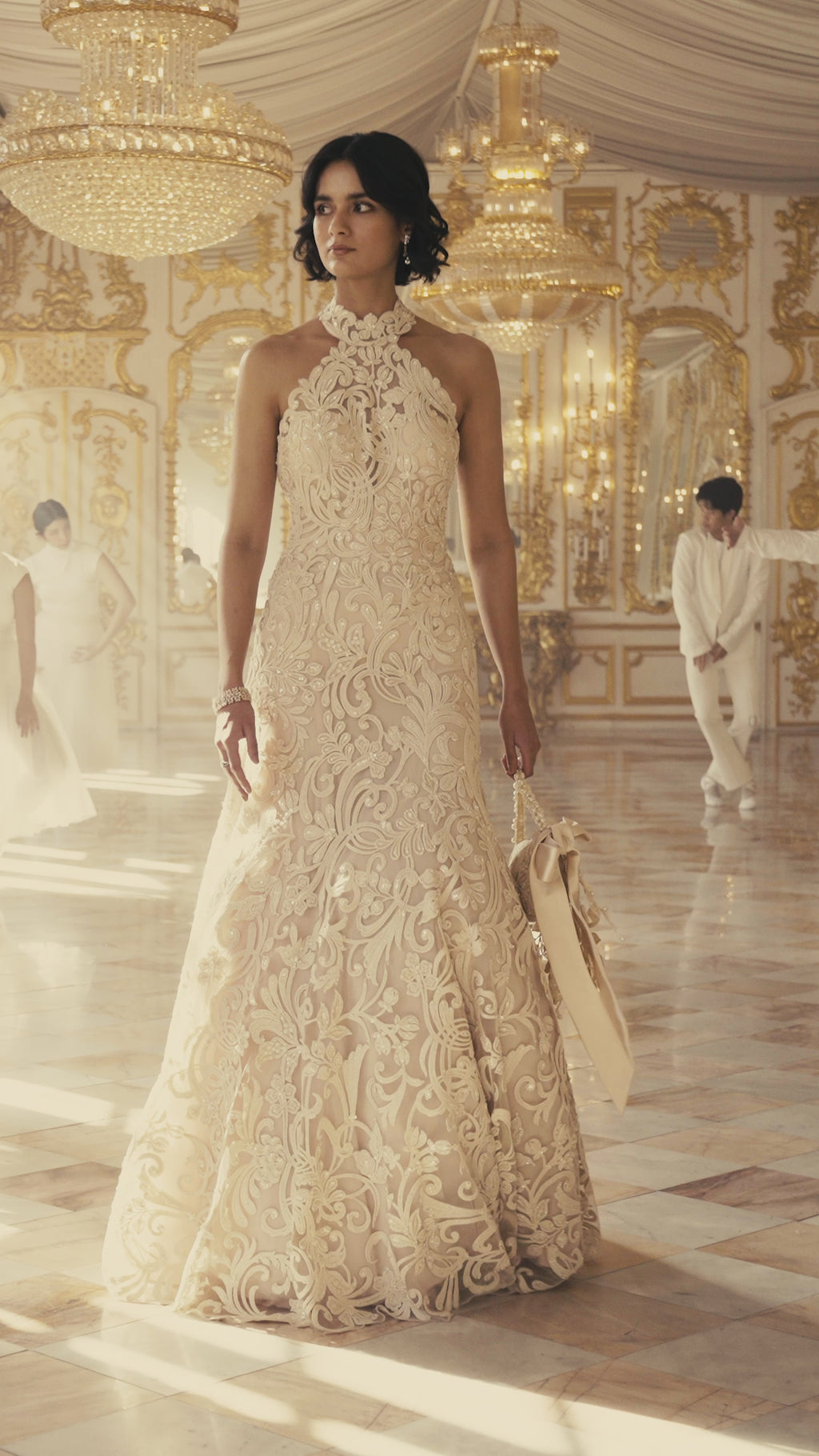 This nude gown features tonal thread, pearl and sequin embroidery in an abstract floral pattern. The gown has halter neckline with a T- back detail.