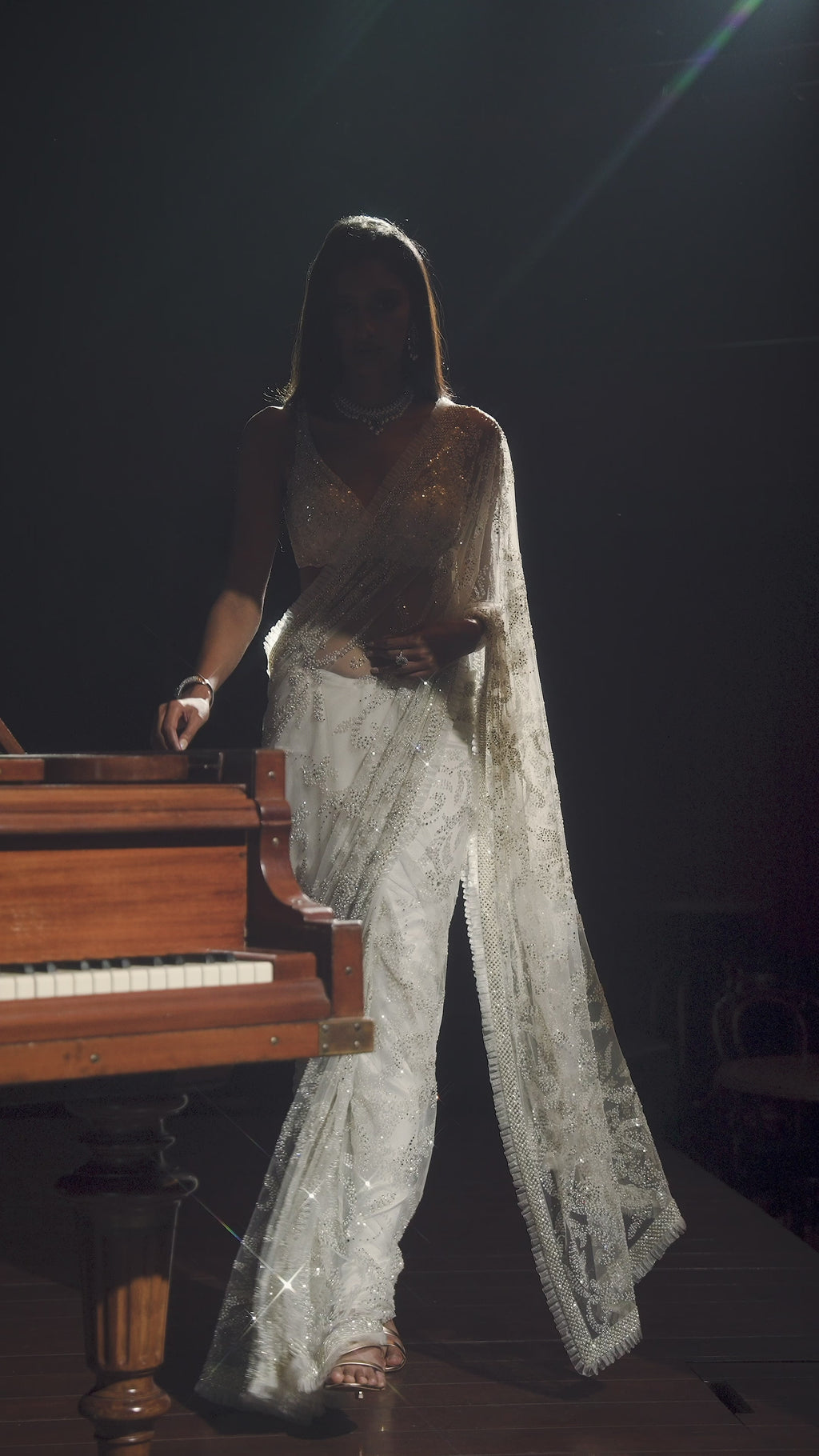 This ivory tulle saree features all over tonal pearl and sequin embroidery in a floral pattern. The fully embroidered blouse has a plunging neckline and shows double strap back with tassels at the waist. The saree is finished with an organza frill.